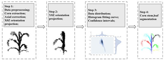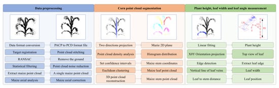 The Velodyne Velo View and Cloud Compare software packages (CloudCompare_v2.11.0_bin_x64 and VeloView-3.1.1-26022015-Windows-64bit) were used as three-dimensional point cloud data processing tools to extract point cloud data. C++ language was used to realize the sampling reduction of point clouds, and a MATLAB program was developed to measure the PH, LW, and LA values of maize. A block diagram of the overall data processing procedure is shown in Figure 4, which includes three parts, that is, data preprocessing, maize point cloud segmentation, and phenotypic parameter measurement. The challenge of maize point cloud processing is how to quickly realize stem–leaf segmentation. The usual method is to convert point clouds into an image, then identify the image boundary and perform ellipse fitting, and finally realize the stem–leaf segmentation of point cloud. To solve this problem, we proposed a fast segmentation method of maize stems and leaves by combining spatial bidirectional projection with normal distribution.