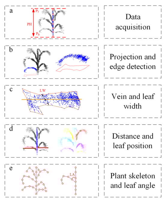 Measurement of morphological parameters of maize. (a) Obtain the height of a single maize plant; (b) projection and edge detection of single leaf point cloud on X0Y; (c) obtain the vein and leaf width of a single leaf; (d) measure the distance between different leaves and stems to obtain the leaf position; (e) maize plant skeleton and leaf angle.
