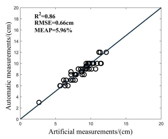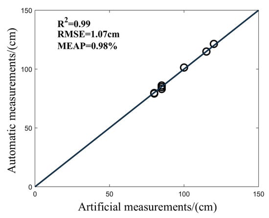 The PH value of Jinyunuo 856 was automatically extracted by the program and compared with the result of artificial point cloud measurement. As shown in Figure 8, the PH of maize is automatically measured. Based on the results, the R2 value is greater than 0.99, indicating an excellent match between values obtained with the proposed method and those with the manual measurements. In addition, the RMSE is 1.07 cm and MAPE is less than 0.98%. The results show that this method has high precision in measuring the PH value of maize, indicating its possible application in the real-world breeding process for maize plants.