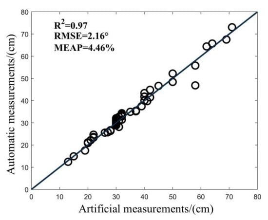 The program was used to automatically extract the LA of Jinyunuo 856 and compared with the artificial point cloud measurement results. As shown in Figure 10, the LA value of maize was automatically determined. R2 is greater than 0.97; RMSE is controlled within 2.16°; MAPE is not more than 4.46%; and the accuracy of automatic measurement of LA is not less than 97%. The results show that this method has high accuracy in measuring the LA of maize, and the measured value of the algorithm is consistent with the real value measured by artificial point cloud. It is feasible to use VLP-16 lidar to collect a maize point cloud and measure the LA of maize. This method can replace manual measurement, improve measurement accuracy and efficiency, and reduce the influence of human factors.