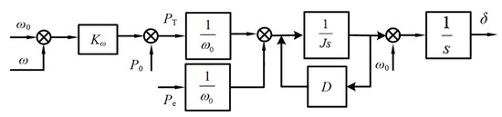 In this context, P0 and ω0 represent the reference power and reference angular frequency of the VSG under rated operating conditions, while PT and ω denote the mechanical power and actual output angular frequency during the VSG’s real-time operation. Kω is the active power–frequency droop coefficient of the VSG. The parameter J represents the virtual rotational inertia of the VSG, which reflects the system’s capability to respond to frequency disturbances, while D is the virtual damping coefficient, responsible for regulating the dynamic characteristics and stability of the system. Pe denotes the electromagnetic power output of the VSG, which is obtained by measuring the three-phase output voltage and current and performing active power calculations. Additionally, δ represents the phase angle of the VSG, Δω is the angular frequency deviation, and t denotes the system’s operational time.