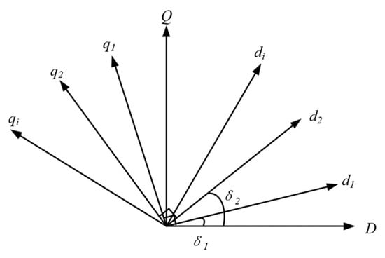 Based on the topology of the multi-VSG parallel system, small-signal modeling was conducted. Considering that the dq reference coordinate systems of different VSGs are not identical, one VSG unit’s coordinate system was selected as the reference coordinate system DQ. The coordinate systems of the other VSG units were then transformed into this reference frame. The coordinate transformation from the dq axis to the DQ axis is illustrated in Figure 3. The transformation process of the rotating dq coordinate system of the ith VSG unit to the reference DQ coordinate system is expressed as:
