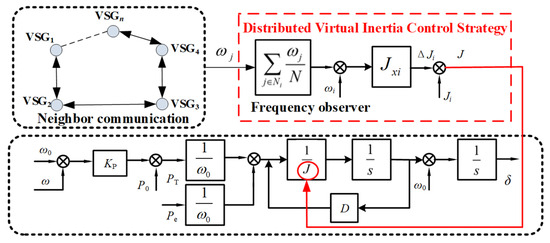 This paper proposes a distributed virtual inertia control strategy based on neighbor communication. By leveraging neighbor communication, quasi-global sharing of frequency information is achieved, allowing the introduction of an additional inertia term to adjust the virtual inertia of the local VSG. This helps suppress frequency oscillations after disturbances. The control block diagram is shown in Figure 4.