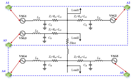 To verify the effectiveness of the proposed virtual inertia control strategy, a parallel system of five VSGs in an islanded mode was built in MATLAB/Simulink (Version: R2022a). The topology of the system is shown in Figure 5, and the simulation parameters are listed in Table 1 and Table 2. The solid black lines in the topological diagram represent power circuits, while the blue dashed lines indicate communication links.