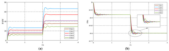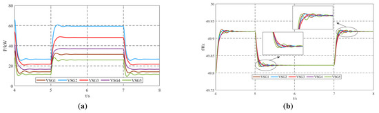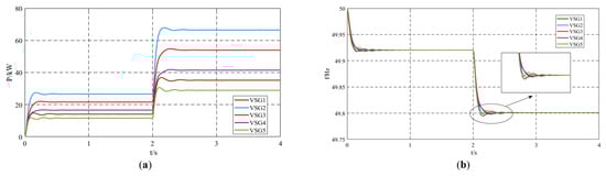 Five VSG units operated in parallel. At t = 0 s, Load1 = 100 kW + 50 kvar was connected, and the system operated under this condition for 2 s. At t = 2 s, Load2 = 200 kW + 100 kvar was added. The active power and frequency output using the unimproved control strategy are shown in Figure 6. Under the conventional control strategy, significant oscillations in the output active power and frequency were observed. System frequency significantly affected the power quality of the grid. During normal load switching, due to the poor dynamic performance of the system, the frequency oscillations were severe, which can harm the power quality of the grid and affect its stability. In severe cases, it may lead to system frequency collapse.
