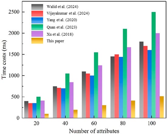 Figure 6. Designcryption after message dissemination. This figure compares the time overhead of the designcryption process after message dissemination. The performance evaluation is based on the work of Walid et al. [3], Vijayakumar et al. [24], Yang et al. [18], Quan et al. [13] and Xu et al. [21].