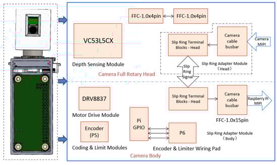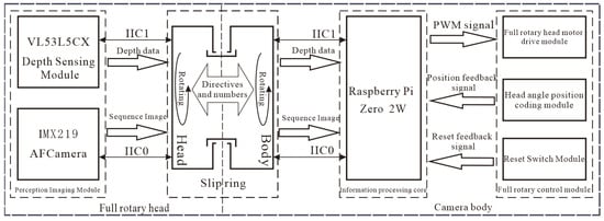 To achieve circular full-depth-of-field imaging, a 360° full-depth-of-field rotary vision imaging system with focus adaptation was independently developed, using a zoom camera with a specific view angle and a depth sensor. The principle of the hardware circuit is shown in Figure 3.
