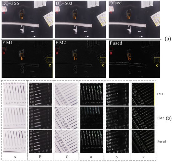 There are three regions, back region A, middle region B and front region C, which represent surfaces of different depths. Dfi (i = 1, 2) represents the images at two different confocal plane depths at view angle ④, and Fused is the fused image for Df1 = 356 mm and Df2 = 503 mm. The a, b and c are the images of the three regions of A, B and C after wavelet change. A comparison of the high-frequency features of the sub-band images before and after wavelet fusion shows that the high-frequency features in the fused image were distributed across all depth surfaces. In contrast, the high-frequency features of the pre-fusion image were limited to specific depth surfaces, with continuous and distinct differences. This demonstrates an improvement in the overall image clarity after fusion and the comprehensive recovery of the information on the pipeline’s inner surface.