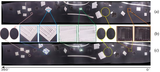 Panoramic view of the inner surface of pipeline model and subjective evaluation comparison. (a) Panorama stitching; (b) Local details and subjective comparative evaluation; (c) Panorama stitching of fixed-focus camera.