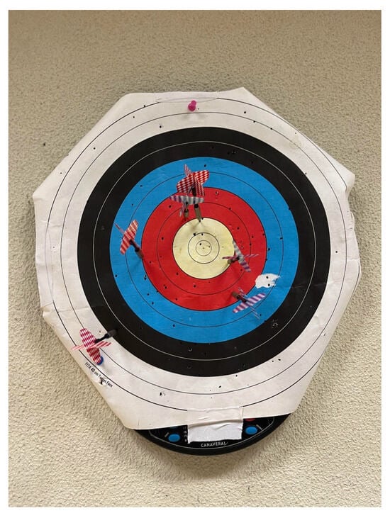 Archery target used in the experiment after a completed trial, with color-coded scoring zones clearly visible. The target’s scoring areas correspond to the participant’s performance, with the final score reflecting the accuracy and precision of the dart throws.