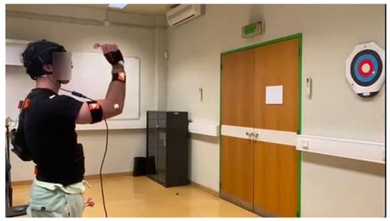 The XSENS MVN Awinda (Movella, Henderson, NV, USA) inertial motion capture system was employed to analyze the kinematics of dart throwing. The XSENS Movella products typically use a combination of IMUs, which consist of accelerometers, gyroscopes, and magnetometers, to capture precise movement data in three dimensions. The set-up can be seen in Figure 2 in which inertial sensors were strategically positioned on the hand, forearm, upper arm, and shoulder of both the dominant and non-dominant sides to capture detailed joint movement patterns.