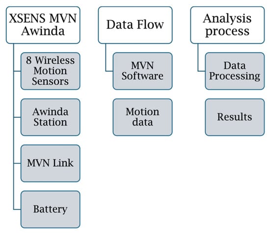 Block diagram illustrating the composition of the XSENS MVN Awinda motion capture system, the data flow, and the analysis process.