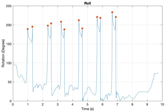 Movement patterns from the hand sensor on the throwing side were examined to identify throwing intervals for all six throws in each trial. Distinct peaks in the transverse plane (roll) indicated the start and end of a throw, marked as red dots in Figure 4. These peaks defined the intervals comprising the throwing period.