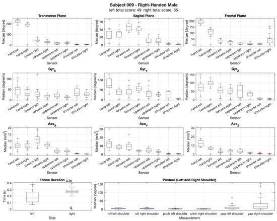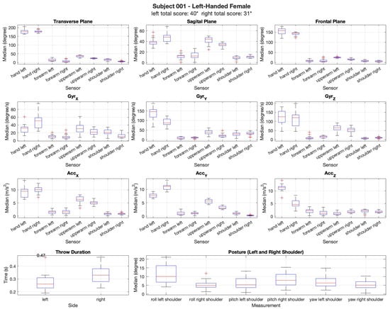 Within these defined intervals, data from all relevant sensors were analyzed by computing the values for each trial. The extracted metrics included roll (rotation occurring in the transverse plane), pitch (movement within the sagittal plane), and yaw (rotation within the frontal plane), as well as gyroscopic and acceleration data along the three Cartesian axes (X, Y, and Z). For each participant for each trial, the median of the sensor-measured values during the throwing phase was calculated. To reduce the influence of outliers and ensure a more accurate representation of the performance, the average of these six median values was then computed to obtain a representative measure for the trial. Subsequently, the mean of the three trials was calculated to provide an overall performance measure for each participant for each limb. This approach facilitated a reliable analysis of the throwing performance by minimizing the impact of variability between individual attempts. The boxplots contrast the data for the left limb and right limb separately for throws executed with each limb. This approach allowed for a clear representation of variability, central tendency, and potential outliers, facilitating the comparison of limb-specific movement characteristics during the throwing task.