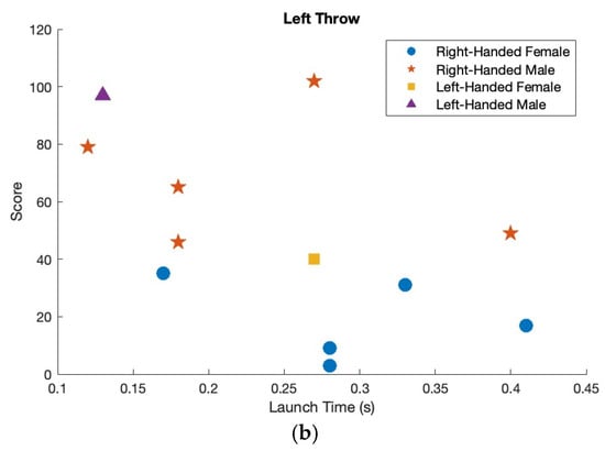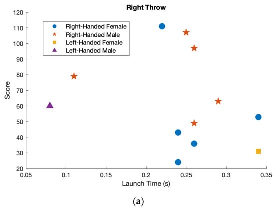 A graphical comparison of throw scores for all participants is shown, displaying performance with both the right and left hands. The right-handed females are represented by blue circles, left-handed female is represented by a yellow square, the right-handed males are represented by red stars and the left-handed male is represented by a purple triangle. (a) Right hand throw. (b) Left hand throw.