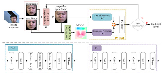 The adaptive DSTNet framework processes onset and apex frames extracted from publicly available ME datasets using their provided temporal annotations. It amplifies the motion of the apex frame to enhance facial muscle movements, which are then fed into a Spatial Network (SN) to extract spatial features representing facial muscle state. Additionally, these amplified frames serve as augmented samples for the training dataset, mitigating the issue of limited ME data. MDOF is extracted between the onset and magnified apex frames for further processing via a Temporal Network (TN) to capture temporal dynamics of facial movement trends. DSTNet deeply extracts and fuses spatio-temporal features to achieve ME recognition. To enhance model robustness, an adaptive strategy is implemented: if the top-1 confidence level is below 0.85, the magnification factor is increased, and the images are reprocessed to extract new magnified apex and MDOF for re-recognition. This iterative process continues until the top-1 confidence exceeds 0.85 or a predefined termination condition is met. This approach effectively represents muscle movement states and trends in ME sequences, and the integration of the dual-stream network with the adaptive strategy significantly improves ME-related feature representation, thereby enhancing recognition performance.