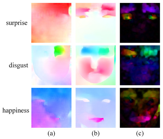 Figure 5, the original RAFT optical flow (first column), derived from the original apex and onset frames, can feature facial region motion but fails to distinguish between ME categories clearly. In contrast, the proposed MDOF (second column) effectively captures crucial muscle movements in different ME categories, such as AU5 (upper lid raiser) in surprise, AU4 (brow lowerer) and AU9 (nose wrinkler) in disgust, as well as AU12 (lip corner puller) in happiness. The sparse optical flow method (third column) demonstrates poor suppression of non-motion regions, introducing considerable noise. These results indicate that MDOF doubly optimizes ME representation by employing a more refined dense optical flow extraction method on magnified apex frames. Without substantially increasing computational cost, MDOF not only highlights motion pattern differences between categories but also suppresses irrelevant noise, thereby providing more discriminative temporal features for improving model performance.