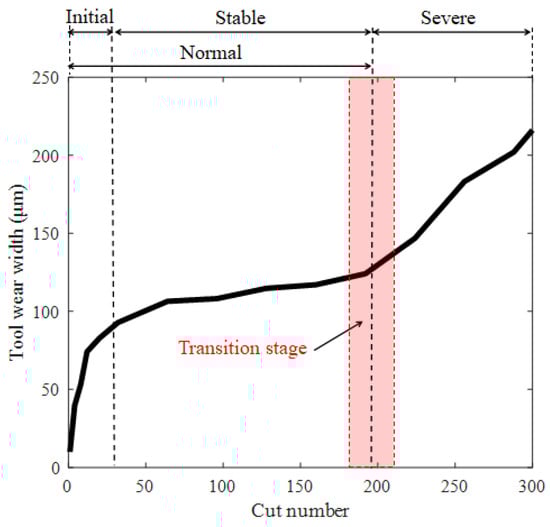 Figure 1. The focus of this study is on determining the timing of replacing worn tools. Since tools in the initial and stable wear stages can be used normally, they are classified as normal wear stages in this study. Usually, the initial wear rate is relatively fast, and it soon enters a stable wear state. During the stable wear phase, the wear width increases slowly. Upon attaining a specific degree of wear, the material of the tool reaches its fatigue limit, thereby entering a phase of severe wear. At this point, the machining accuracy is significantly reduced, and the surface roughness also increases. Therefore, the optimal timing for tool replacement is during the transition stage from stable wear to severe wear. In existing research, both tool wear regression and tool wear classification require measuring tool wear values. In classification research, it is necessary to accurately classify training samples based on wear width. In regression research, wear width is used as the training target. In order to collect a sufficient number of training samples, it is necessary to frequently stop machining to measure tool wear during the model training phase. Therefore, the research results are difficult to apply widely in practical production.