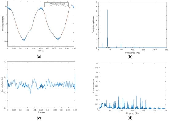 30]. Additionally, this method does not have the above-mentioned problems. Therefore, a Vold–Kalman filter is used to obtain the spindle rotation frequency and its first 15 harmonic components from the original current signal. These components are summed to form the fundamental signal, as shown by the orange curve in