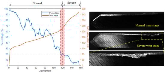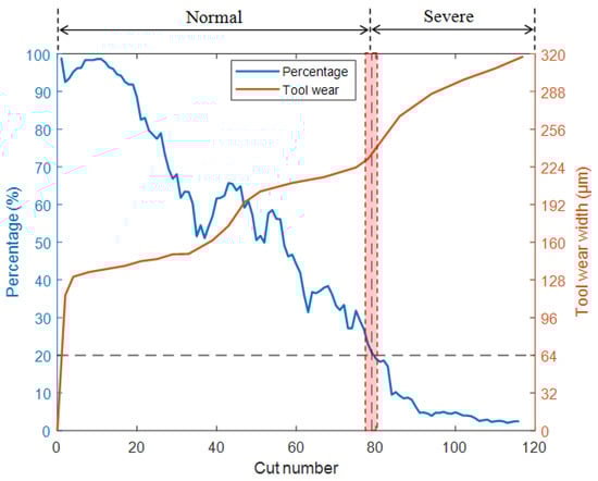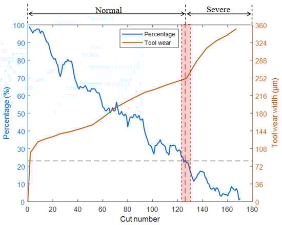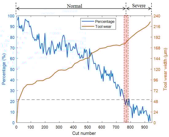 Figure 14. As the tool wears, the wear transition percentage decreases continuously. When the percentage drops to around 21%, the tool state is in a transitional stage from normal wear to severe wear. The results are consistent with Experiment 1, demonstrating the robustness of the method under varying processing parameters.