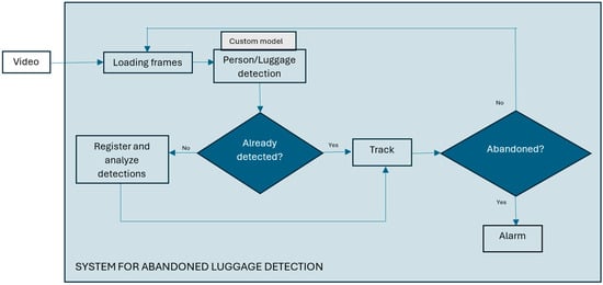 The system components for abandoned luggage detection are shown in Figure 2. The system loads video stream from a surveillance camera and then takes frames from the video every 0.25 s in order not to lose useful information from the footage and to speed up image analysis. Each extracted image is the input to a customized object detector that detects all people and luggage in the input image that is in the camera’s field of view. For tracking the detected objects across frames, we used YOLOv11’s default multi-object tracking algorithm, ByteTrack. ByteTrack works by associating detections frame by frame, keeping high-confidence detections while also considering low-confidence ones to improve tracking stability. This approach ensures better object identity persistence and reduces the tracking errors in complex environments, enabling a robust monitoring of luggage movement and ownership status [13]. It is crucial for the detection model to accurately identify people and luggage in real time with a high response rate, ensuring that no potentially suspicious objects go undetected.