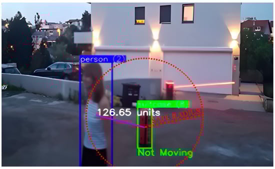 The key parameters in the algorithm for detecting abandoned luggage include the movement threshold, the radius of association (i.e., the distance between a person and the luggage) (Figure 3), and the duration the luggage remains stationary. These parameters were defined in advance based on the system configuration but can be adjusted to the specific characteristics of the environment and the technical recording conditions to improve the accuracy of abandoned luggage detection.