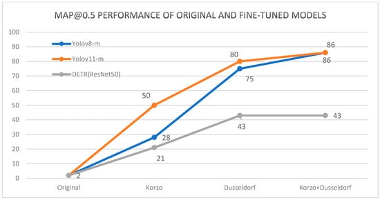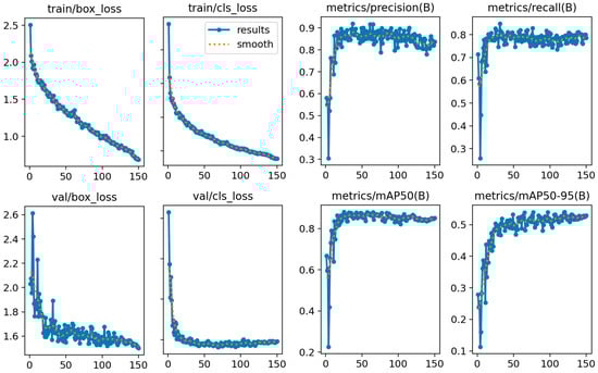 In recent years, the goal of YOLO model development has been to extract and process features as efficiently as possible, while maintaining high accuracy [14,15]. The design of the YOLOv11 model has resulted in higher average precision (mAP) on datasets such as COCO, so that, for example, with 20% fewer parameters, it achieves even slightly better results than YOLOv8m. That is, with the same number of parameters as YOLOv8m, it achieves a 3% higher average precision, which roughly corresponds to the results achieved by the largest YOLOv8x model. A comparison of different versions of the YOLOv8 and YOLOv11 models is presented in Table 2. All models were pretrained on the COCO dataset, and more complex versions of the models of each family achieve higher accuracy but require more powerful computational resources [2].