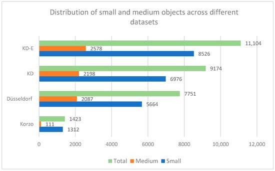 The CCTV-KD dataset included no large objects, resulting in an AP_large score of −1.0, primarily due to the security camera setups covering wide areas, causing objects to appear smaller and further away. In total, the dataset contained 9174 labeled objects, of which 6976 small objects and 2198 medium objects (Figure 13), confirming the absence of large objects.