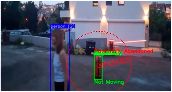 When both conditions are satisfied, i.e., the luggage is left unattended outside a predefined radius and has remained stationary for a certain time greater than the duration set in the system, then the system marks the luggage as abandoned. These conditions are set to include all possible cases that may exist involving people, the owner of the luggage, and the luggage, and to reduce the number of false positive detections.