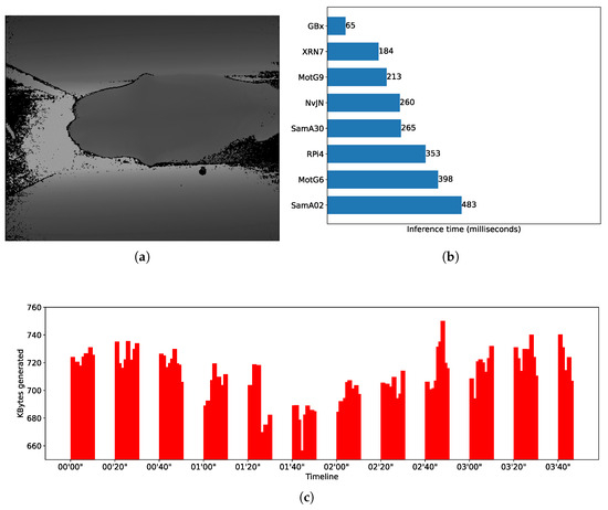 BCS—workload characterization. (a) Input image example taken using the Kinect v2 depth camera. For reference, the image partially shows the cow’s crest/neck on the right, the rump/tail head on the left, and the walls of the runway to the milking parlor on the top and the bottom. (b) SqueezeNet model benchmarking. Numbers represent inference time per depth image in milliseconds. (c) BCS data stream excerpt.