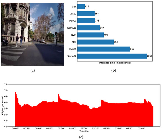 SWT—workload characterization. (a) Input image example. (b) YoloV4 tiny model benchmarking. Numbers represent inference time per image in milliseconds. (c) SWT data stream excerpt.