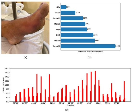 DMED—workload characterization. (a) Input image example. (b) EfficientNetB4 model benchmarking. Numbers represent inference time per image in milliseconds. (c) DMED data stream excerpt.