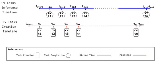 One of the metrics we report is accumulated inference latency, a measure of how long the makespan deviates from the stream time. The stream time is the time window where CV tasks are created, while makespan is the time the inference system employs in completing all the created CV tasks. Figure 5 graphically represents how these entities coexist in time. Inference completion of a task naturally occurs in the time after the CV task creation. While task creation can occur by following a quite controlled and periodic process, the task inference process cannot be so controlled. This is what and represent in the CV task inference timeline associated with each CV task completion event—i.e., different completion times could be given as a consequence of completion, but they are not limited to variations in network latency, CNN data input content, and node execution capability. When subtracting stream time from makespan, the result is the accumulated inference latency. The closer this difference is to zero, the better the setup capability is at responding with proper inference times compared to the time taken to create all CV tasks. A derived metric that gives a notion of the average time employed by the setup to complete a CV task after a new CV task is available could be obtained by dividing the accumulated inference latency by the number of CV tasks created. We call this the inference latency.