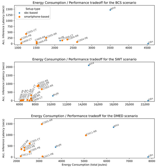 In view of the high energy consumption that AI applications already demand and expected further increases, studies in this regard [41,42,43] and initiatives such as the Low-Power Recognition Challenge [44] encourage the improvement of not only DL model performance but also the energy that execution and training consume. Thus, we study the tradeoff between performance and energy consumed in all evaluated scenarios. Figure 8 reports the energy consumption and accumulated inference latency tradeoff between different setups in each tested scenario. The best setups are those that achieve the minimum accumulated inference latency using the least energy, i.e., those positioned close to the origin. As can be observed, in all scenarios, the best balance is always achieved by orange dots with a label starting with Cl, which corresponds to smartphone-based setups. It can be noted, for instance, that the accumulated inference latency of GBx setups are the lowest in BCS, SWT, and DMED scenarios; however, these are also associated with the highest values of energy utilization—4524, 22,403, and 7834 Joules, respectively. Interestingly, smartphone-based setups, particularly four-node clusters using Pull-Based and ComTECAC load balancing schemes, offer a good tradeoff in all scenarios, i.e., competitive performance with reduced energy consumption. Some examples are Cl409-PB, Cl408-PB, and Cl411-PB for the BCS, SWT, and DMED scenarios, respectively. Also, Cl409-CT and Cl411-CT for BCS and DMED, respectively. In other words, for the BCS scenario, when it is acceptable to have all CV task results calculated with a delay of 7.8 s w.r.t to the fastest setup—GBx—Cluster 409 with a Pull-Based scheme can achieve the objective by utilizing ∽1510 Joules, i.e., almost three times less energy than the Gigabyte Brix setup. Similar relations can be found for the SWT and DMED scenarios.