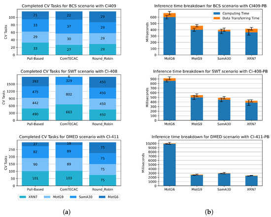 Figure 9 shows insights on how workload execution was distributed by different load balancing schemes among smartphones integrating the most competitive clusters with four nodes for all scenarios and a breakdown of the inference time registered by the mobile distributed inference approach showing the relations among computing/communication time disaggregated by smartphone models. Particularly, in Figure 9a, for all scenarios, it can be observed that, as expected with Round Robin load balancing, all smartphone models—differentiated in blue tones—are assigned with (and complete) the same amount of CV tasks. This behaviour does not allow for efficiently exploiting the computing heterogeneity of smartphones. With a Pull-Based scheme, on the contrary, smartphones are assigned new tasks as soon as they deliver the results of the previous pulled task. Such a reactive behaviour allows the distributed inference approach to assign CV tasks considering node heterogeneity. Notice that the XRN7 smartphone, which is one of the fastest within the clusters (see Figure 9b), is assigned the largest number of CV tasks in all scenarios. Conversely, MotG6, which is the slowest, is assigned the least CV tasks. Finally, ComTECAC CV task amounts are similar to those of the Pull-Based scheme, especially in short-duration workload scenarios like BCS and DME, which explains why both load balancing schemes achieved such similar accumulated inference latency values. Contrary to the Pull-Based scheme, ComTECAC assigns CV tasks proactively, i.e., deciding which node should be in charge of the task as soon as the task is created using a formula that combines network performance, node computing capability measured in FLOPS, queued tasks, and historic contributed energy measured through current battery level. For short-duration scenarios, few to none of these indicators vary—i.e., they remain almost constant. Consequently, each node’s rank is mostly decided by their FLOPS indicator value. This explanation does not apply to the behaviour that ComTECAC presents in the SWT scenario with a 30 min workload, where contributed energy varies. Certainly, this scenario provides evidence that the ComTECAC formula can be subject to further improvements. Lastly, Figure 9b shows how inference time is divided for individual images—not CV tasks—into computing time and data transferring time. Clearly, in all scenarios for all smartphone models, computing time dominates transferring time describing ratios that are in [1/13–1/19] for BCS, [1/10–1/15] for SWT and, [1/27–1/85] for DMED scenario. This could be taken as a hint of how energy consumption of the mobile distributed inference approach is disaggregated. Unless energy consumption in transferring time exceeds that of computing time by the inverse ratio of those reported, we could say that computing time dominates energy consumption.