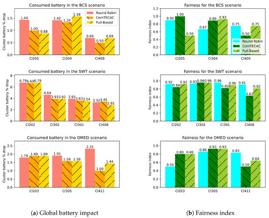 Finally, we analyse fairness values derived from applying the Round Robin, ComTECAC, and the Pull-Based load balancing schemes. The index serves as a hint on how the edge cluster utilizes energy from all participating smartphones. The more the value approximates to one, the more balanced the battery utilization is among nodes, which, in turn, is an indicator of how well the level of parallelism is maintained over time. Figure 10b reveals that in some clusters, the Pull-Based scheme achieves slightly higher fairness values than those of Round Robin, while in other cases, the results are the opposite. There are cases where both schemes achieve equal fairness values. By contrast, ComTECAC fairness values are mostly under those obtained by the Pull-Based approach and in some cases, they are also under Round Robin fairness values. There is not a clear pattern to conclude that one load balancing scheme is better than the others according to the fairness index.