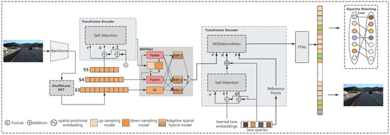 During the testing process, it can directly generate all the results, thus avoiding the complex post-processing procedures. LSTR [] has been proposed as an end-to-end method, which uses Transformer blocks to directly learn the curve parameters of the lane shape model through a network established based on DETR. O2SFormer [] has been proposed as a model that introduces a one-to-many label assignment strategy to address the issue in the lane recognition process where the label semantics reduce the training efficiency in DETR. However, these methods do not make full use of the features extracted by the backbone network. The DETR architecture has the drawbacks of excessive computational overhead, which makes it unsuitable for adding multi-scale features, and it also performs poorly in recognizing small structures. Recent approaches have addressed these shortcomings and brought about performance improvements. Deformable-DETR [] has been innovatively designed as a deformable attention module. This module focuses on a small number of sampled positions and serves as a pre-filter to screen out prominent key elements from all the pixels of the feature maps. It combines the advantages of the sparse spatial sampling of deformable convolutions and the relational modeling ability of the Transformer. Without sacrificing performance while reducing the number of parameters, it accelerates the convergence of the model. Moreover, this module can be naturally extended to aggregate multi-scale features, thus solving the problem of DETR’s poor performance in recognizing small structures. RT-DETR [], on the other hand, has been designed an efficient hybrid encoder. By decoupling the intra-scale interaction and cross-scale fusion, it can process multi-scale features rapidly to improve the speed. Additionally, it proposed a query selection method with the least uncertainty, which provides high-quality initial queries for the decoder, thereby enhancing the accuracy. These improvements have made detectors comparable to DETR more competitive.