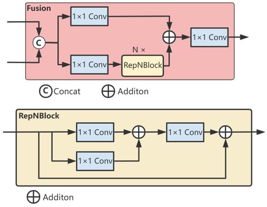 First, we fuse the two adjacent high-level features, S4 and F5, through the fusion module to obtain the fused features P4 and P5 at their respective scales. The fusion block contains two 1 × 1 convolutions to adjust the number of channels, and N RepBlocks composed of RepConv [] are used for feature fusion. The outputs of the two paths are fused by element-wise addition. One part of the features extracts semantic information through multiple convolutional layers, while the other part directly retains the original information. Then, these two parts of features are fused by addition so that the fused features contain both the abstracted high-level features and the original low-level detail features. The structure is shown in Figure 4.