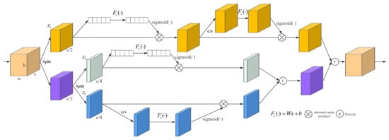 We generate spatial attention by leveraging the spatial relationships of the features. To calculate the spatial attention, first, channel pooling is performed on the feature map. We use Group Normalization (GN) [] for and to obtain the spatial statistics. For , n = 2, and for , n = 4. Then, the obtained vectors are activated to obtain the attention weights in the spatial dimension and is adopted to enhance the representation of . This method is used to associate long-term dependencies. The final output of the spatial attention is obtained as follows: