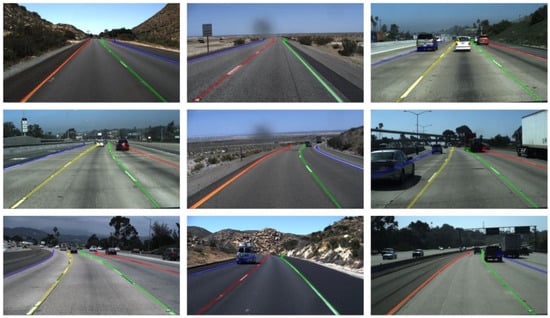 - Li, X.; Li, J.; Hu, X.; Yang, J. Line-CNN: End-to-End Traffic Line Detection With Line Proposal Unit. IEEE Trans. Intell. Transport. Syst. 2020, 21, 248–258. [Google Scholar] [CrossRef]