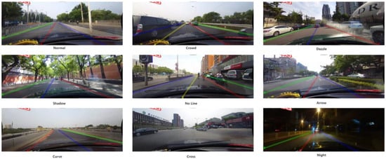 CULane is a large-scale open-source dataset collected by on-vehicle cameras in urban and highway scenarios in Beijing, China. It consists of 88,880 training images, 9675 validation images, and 34,680 test images. All images are of size 1640 × 5920 pixels. This dataset covers a variety of traffic scenarios, including normal, crowded, dazzling, shadow, no line, arrow, curve, cross-road, and night.