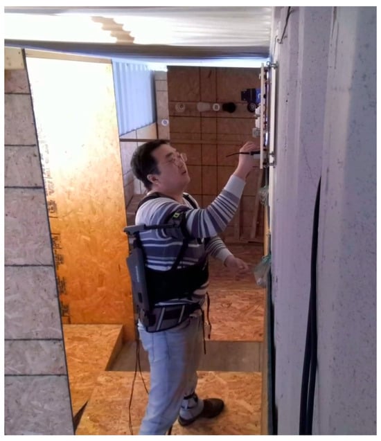 Image of a subject performing simulated wiring tasks while wearing a shoulder exoskeleton. The exoskeleton occluded joints on the upper arm, the back, and the right hip.