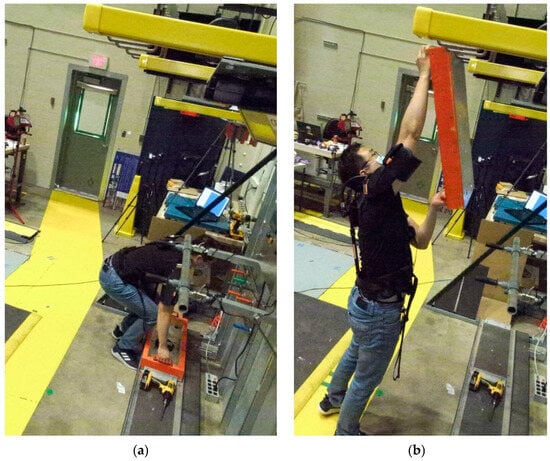 A subject performing a load positioning task simulating material handling in the manufacturing industry while wearing a shoulder exoskeleton. The task begins with (a) lifting the load from the ground, providing a view of back and knee flexion from the sagittal plane. The task ends with (b) hanging the load overhead, requiring arm extension and flexion.