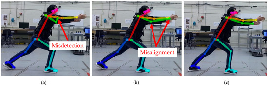 Pose estimation result showing (a) a misdetection, where the left arm posture is incorrect; (b) a misalignment, where the detected joints on the left arm are not aligned with the actual joints; and (c) a correct detection, where the detected joints appear to coincide with the subject’s joints.