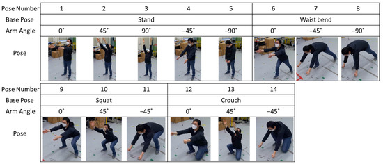 Fourteen industrial task poses were defined based on observed task poses from exoskeleton performance tests for industrial tasks, including load handling, peg-in-hole, load alignment, and applied force [11,12,44]. Each pose is a combination of base poses and arm angles. Base poses represented the following four positions: stand, waist bend, squat, and crouch. Arm angles included 0°, 45°, 90°, −45°, and −90°, where the arms stretched forward, forward-up, up, forward-down, and down, respectively. Figure 4 shows the subject performing each task pose.