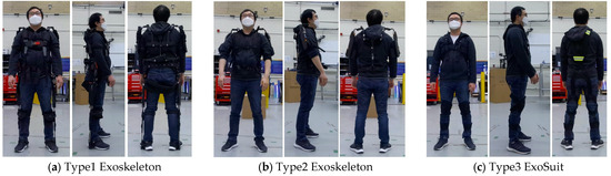 The subject wore (a) a full-body exoskeleton, (b) a shoulder exoskeleton, and (c) an exosuit.