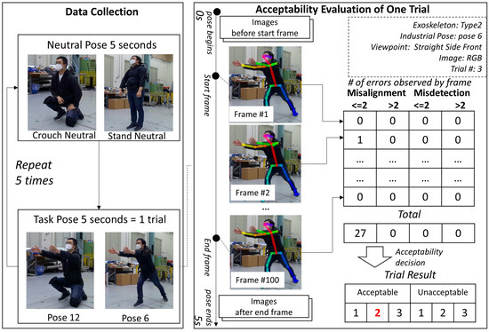 For each exoskeleton, pose, and viewpoint, images were collected using the following procedure. The subject began each trial in either a crouching or a standing neutral pose, as shown in Figure 7. For industrial crouching poses, the subject began in a crouching neutral position. For standing, bending, and squatting industrial poses, the subject began in a standing neutral position. Second, the subject held one of the 14 industrial task poses for 5 s. Third, the subject returned to a neutral standing pose. The subject repeated the task pose and the neutral pose five times. Out of 150 collected frames, 100 frames were selected for the evaluation of each trial. Beginning and end frames were not used, as the subject sometimes moved at the start and end, and especially when wearing an exoskeleton. Figure 7 describes the data collection and evaluation procedure.