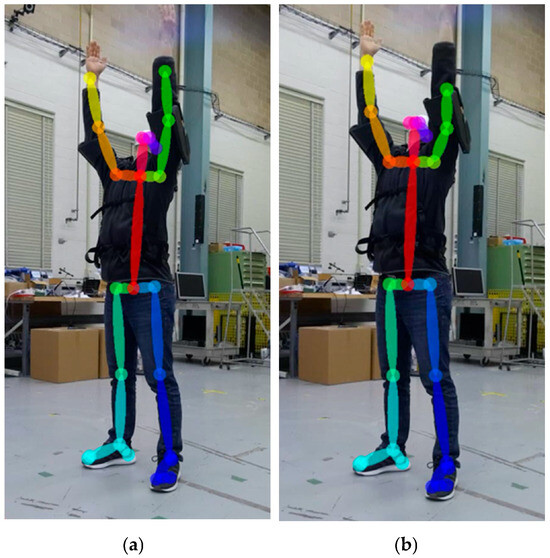 As current pose estimation training datasets often do not include images of people wearing exoskeletons, algorithms based on these datasets may not be accurate for people performing tasks while wearing exoskeletons [25]. In addition, the newer pose estimation algorithms showed similar performance compared to the systems used in this study, as subjects with wearable devices may not be present in the models’ training sets [52]. Therefore, new models [53] may be created by including annotated images of people wearing exoskeletons [12] in existing training datasets. These annotations could be performed by creating a new neural network model in a software package such as DeepLapCut [54]. In addition, new pose estimation algorithms could be formulated to track individual points on both the human and the exoskeleton. These algorithms could be used to analyze the fit of an exoskeleton as well as track how well the exoskeleton aligns with the body while performing industrial tasks [53]. The algorithms could reduce incorrect joint estimation from occlusions by exoskeletons. Another area to extend the research and development of pose estimation algorithms is for clinical evaluations of exoskeleton use, such as gait pattern and gross motor function analysis [55].