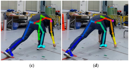 Table 9 shows how the occlusions due to viewpoint affected the body estimation performance. When the images were taken from the side, the arm, leg, or both on the other side would be invisible to the sensor. When the images were taken from the back, the arms would be invisible unless the task involved overhead work, where the arms would be in an upward position. From the back, the knees could become less discernible unless the subject was in a standing position. The camera’s vertical angle could also change the visibility of the joints. Figure 12 shows how the pose estimation changes depending on the camera’s vertical angles.