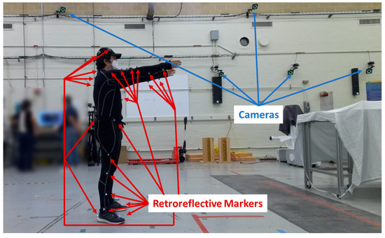 A total of 20 optical tracking cameras were mounted to walls, with some at a height of 2.7 m and others at a height of 4.3 m off the ground, within a 9 m wide × 22 m long × 7 m high test area. Data were acquired at a rate of 120 frames per second using Motive Software Version 1.10 [46]. The subject performed the test in the center of the test area. Figure 9 shows some of the cameras and the subject wearing the motion capture suit with passive retroreflective markers. Based on pre-programmed biomechanical skeleton marker sets, the retroreflective markers were attached to the suit, hat, shoes, and exoskeleton (when the exoskeleton frame or straps occluded the anatomical landmarks). The conventional skeleton marker set [47] was used for the control and Type 1 exoskeleton, while the Rizzoli skeleton marker set [48] was used for the Type 2 and Type 3 exoskeletons based on the inability to track the subject using the conventional model. The Rizzoli marker set could be constructed for skeletal tracking despite the adjustments to the skeletal marker sets to accommodate the occlusions caused by the exoskeletons. Additional markers were attached to the arms so they could be manually estimated. RGB videos were recorded to evaluate the OTS pose estimation results. Figure 9 shows the setup for optical motion capture, and Figure 10 shows the skeletal tracking result with the conventional and the Rizzoli marker sets.